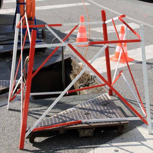 Garde-fou fibre optique repliable à mettre en place sur les chantiers pour sécuriser les chambres télécoms durant les interventions.