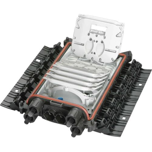 Le boîtier de protection d'épissures étanche Corning taille 1 permet le raccordement jusqu'à 72 épissures mécaniques type Fibrlok et 144 épissures fusion. L'organiseur accepte 12 cassettes avec de la micro-structure en passage et 8 lors du stockage de structure type loose tube.