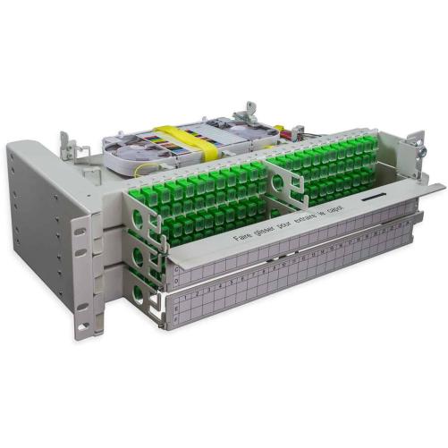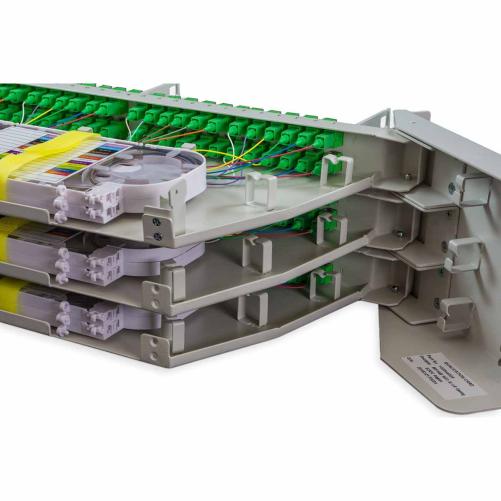 Ce tiroir 19" pivotant modulaire 3U 144 FO avec raccords SC/APC et fibre optique G.657A2 possède une ouverture gauche complète avec pigtails montés, raccords, gestion des fibres, cassettes et supports d'épissure.