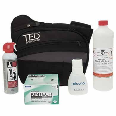 Ce kit contient tout le matériel nécessaire pour vous aider à assurer un nettoyage complet, rapide et efficace des réseaux de fibre optique. Vous y retrouverez de l'alcool isopropylique accompagné d'un distributeur d'alcool, un dégraissant en spray et des lingettes sèches pour le nettoyage de la fibre optique. Une sacoche porte-outil permet d'optimiser le transport de ce kit de nettoyage.