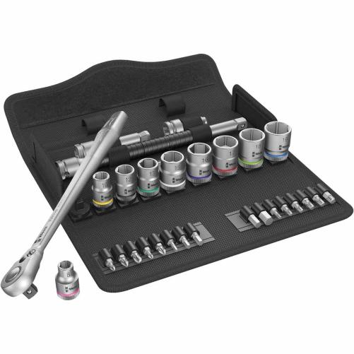 Le jeu de cliquet 3/8 WERA est composée de 29 pièces, comprenant un cliquet avec levier d'inversion, 9 douilles, 16 embouts, 2 barres d'extension et un adaptateur Cyclone.