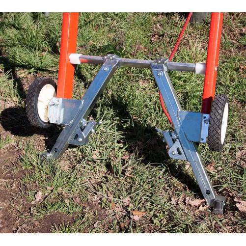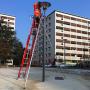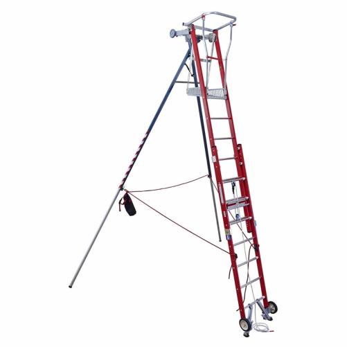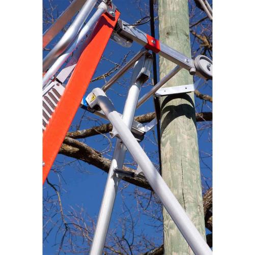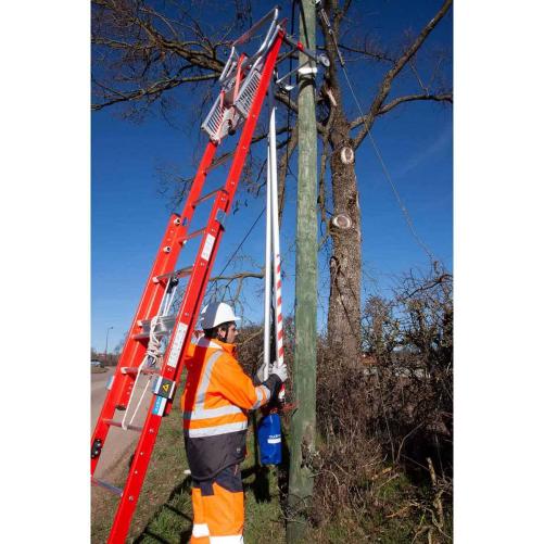 Cette échelle 2 plans avec une plateforme de travail et ses jambes réglables permet un travail en contact mais sans appui haut sur le poteau : c’est la seule solution autorisant la montée sur poteau bois en toute sécurité. A l’aide d’un berceau d’appui et de deux jambes en X apportant une très bonne stabilité, la mise en place est simple et rapide : moins de 3min pour un technicien seul.