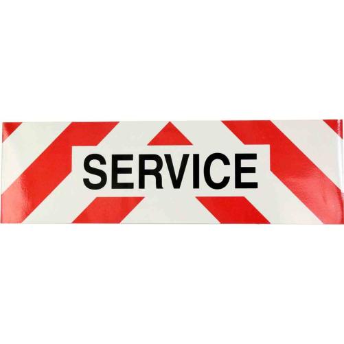 Ce panneau de balisage est à apposer sur le véhicule pour signaler une intervention sur la voie. Le message "SERVICE" y est marqué en noir, sur chevrons rouges et blancs réfléchissants pour assurer une bonne visibilité.