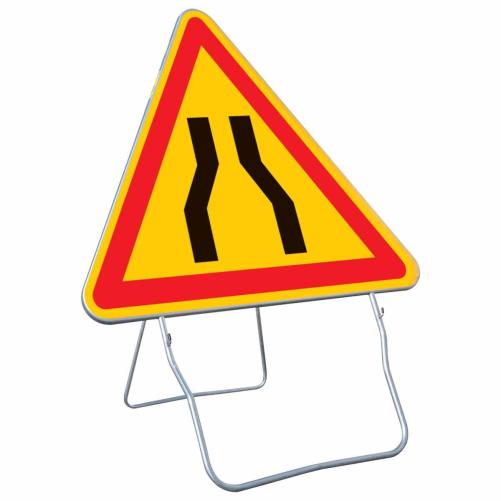 Panneau de chantier sur pied lyonnais permettant d'indiquer que la chaussée se rétrécie. Il dispose d'ergots pour maintenir le pied arrière bloqué automatiquement en position ouverte ou fermée et d'une poignée de transport très résistante.