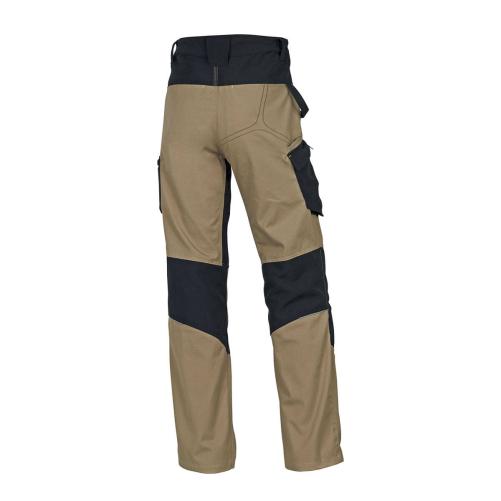 Pantalon de travail beige et noir, très pratique avec de nombreuses proches. Triples coutures et tissu de qualité = excellente durée de vie. Il dispose d'emplacement pour y insérer des protège genoux afin d'offrir plus de confort lors des travaux à mi hauteur.