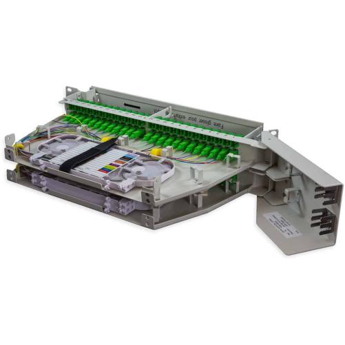 Ce tiroir 19" pivotant modulaire 2U avec raccords SC/APC et fibre optique G.657A2 possède une ouverture gauche complète avec pigtails montés, raccords, gestion des fibres, cassettes et supports d'épissure.
